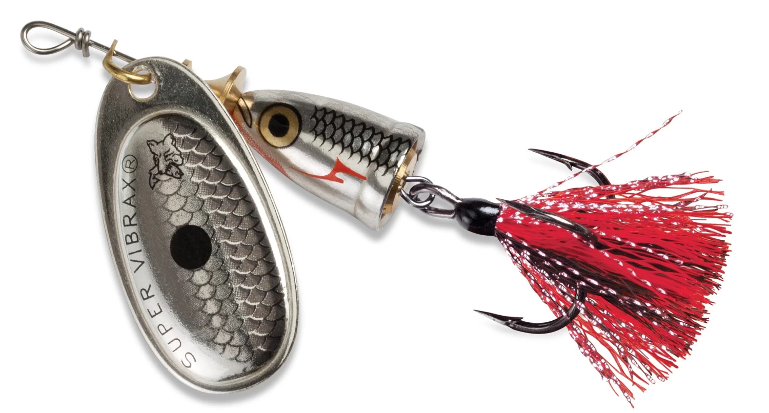 - Blue Fox Classic Vibrax Foxtail is an inline spinner with a calf tail and fiber hackle dressed treble hook.