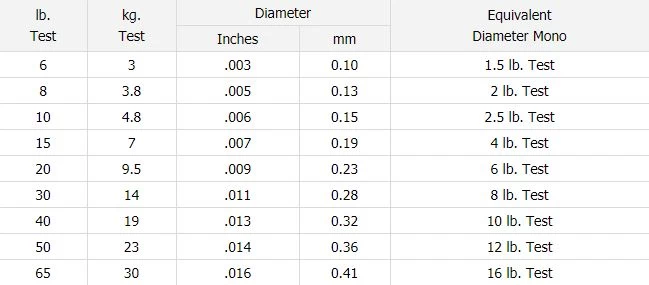 | Pound Test | Kilogram Test | Diameter | Equivalent Diameter Mono | |