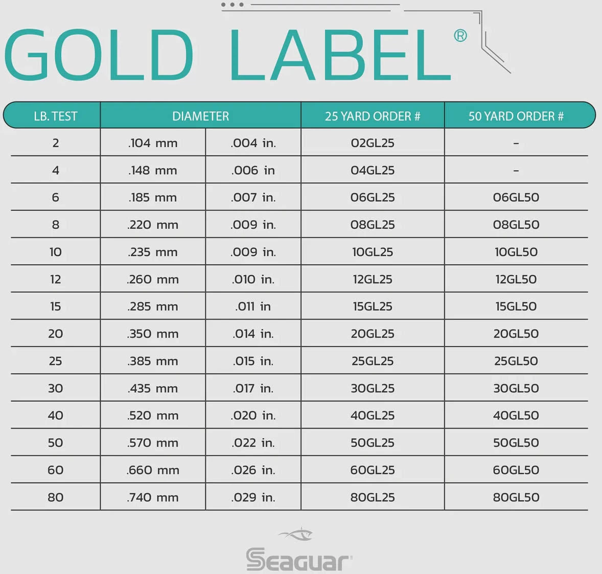 - Gold Label Fluorocarbon is available in pound tests ranging between 2 and 80 pounds. Available in 25 yard and 50 yard spools.