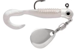 The VMC Curl Tail Spin Jig is a small curly tail bait rigged on a ball head jig with a swivel mounted Colorado blade. It comes pre-rigged a TriggerX® Curl Tail Body with a long micro-thin tail that swims with a light and subtle vibration. Perfect choice for fishing for bluegill, crappie, and other panfish in stained water where you want some extra flash and vibration. Equipped with a premium VMC power gap hook that has a 5% wider gap than traditional jig hooks.