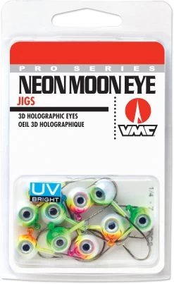 - The VMC Neon Moon Eye Jig UV Kit is an assortment of round head jigs featuring large holographic fish eyes and UV colorways.